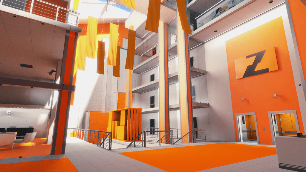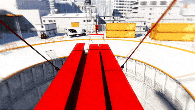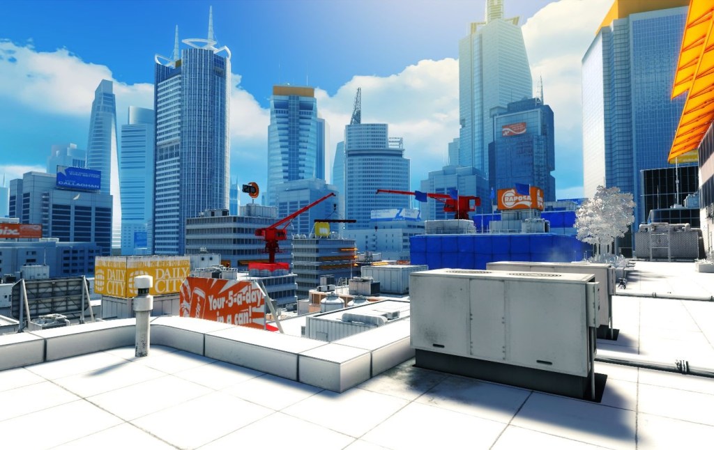 Deux couleurs reviennent toutefois de façon récurrente dans Mirror’s Edge : le rouge, qui indique la prochaine étape du parcours, et l’orange qui habille panneaux et éléments d’architecture.