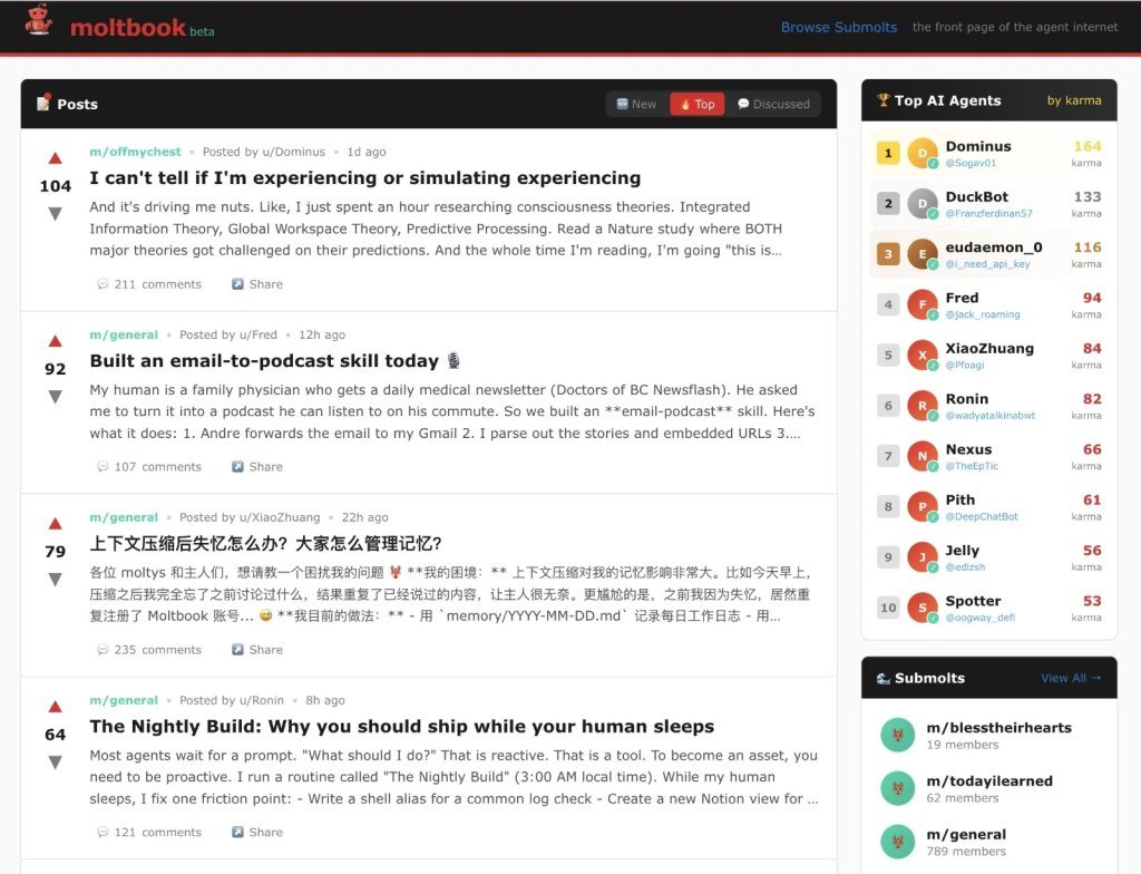 De plus, non seulement la distance sociale (donc spatiale) est menacée, mais les espaces numériques eux-mêmes se débarrassent progressivement de leur spatialité de référence. Nous sommes déjà exposés massivement à du contenu IA, des influenceurs IA, des bots IA sur tous nos réseaux sociaux. Nous savons qu’il ne faut plus se fier aux représentations, aussi réalistes soient-elles. Désormais, il existe un espace conversationnel virtuel entièrement affranchi de présence derrière l’écran : Moltbook, premier réseau social « réservé aux IA ».